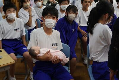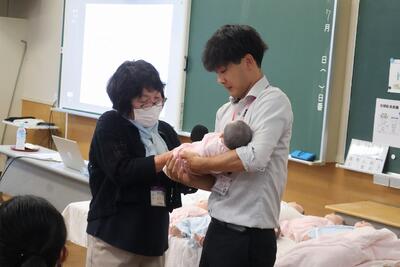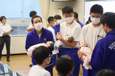 講話では、紙に開いた穴で卵子の小ささを示していただいたり、赤ちゃんの人形を抱っこさせていただきました。