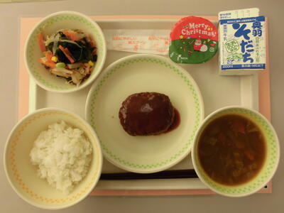 今日は、給食記念日献立で、ハンバーグにカレースープ、クリスマスデザートのいちごゼリー🍓と、みんなが嬉しいメニューが勢ぞろいでしたね。